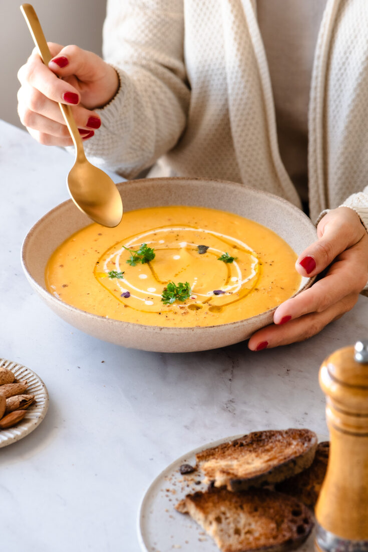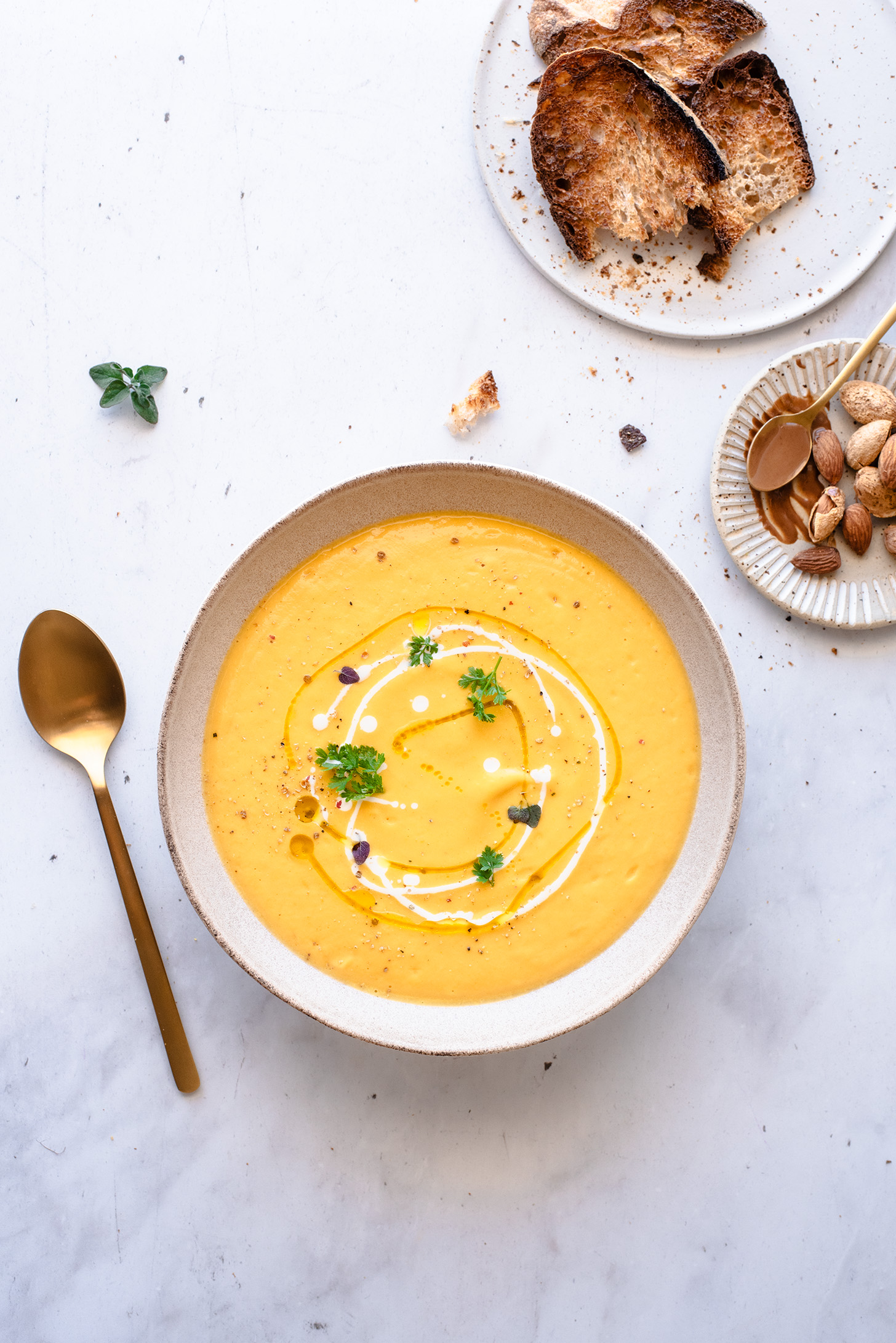 Some things are so simple: like the cup of coffee brewed the same way for over a decade, or the piece of freshly baked bread with butter. They are classics and bring us back to our roots. And while new things and foods keep popping up left and right of us, we keep returning to those classics. They give us comfort in a time up unrest and they bring us back to the memories that are engraved in our hearts and souls. This soup is just that. A bowl of comfort. Without any fuss or fancy ingredients. Simply pumpkin. With a touch of almond butter, because we can.