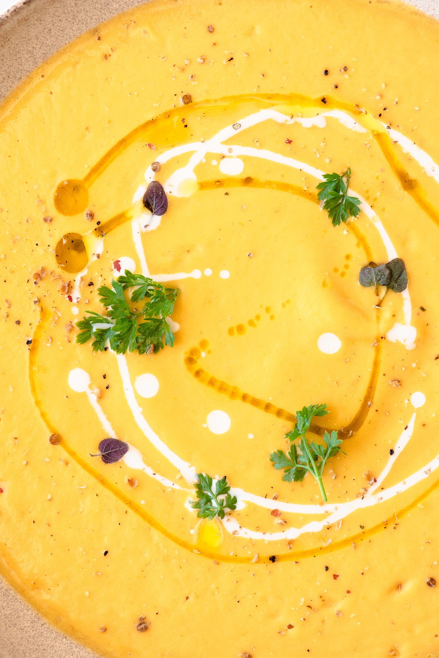 - Season with salt and pepper and garnish with olive oil, (vegan) cream, and a few herbs.